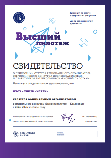 Лицей «ИСТЭК» получил статус Регионального организатора Всероссийского конкурса исследовательских и проектных работ школьников «Высший пилотаж»